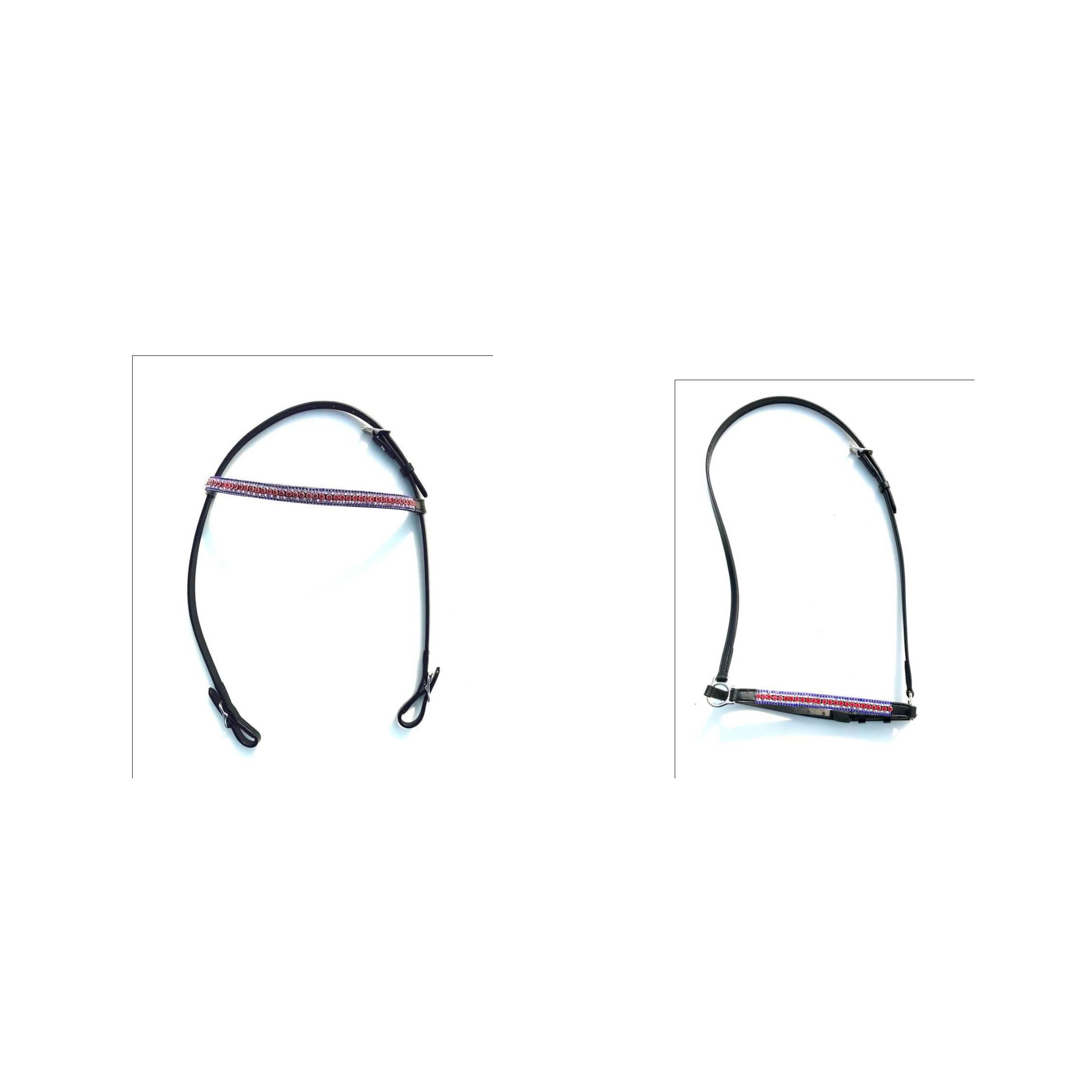 This set features a crystal/rhinestone-studded Browband and Noseband known for adding sparkle and aesthetic appeal to the bridle. The design uses decorative, colored stones to create a striking, eye-catching look, often seen in show or competition settings.